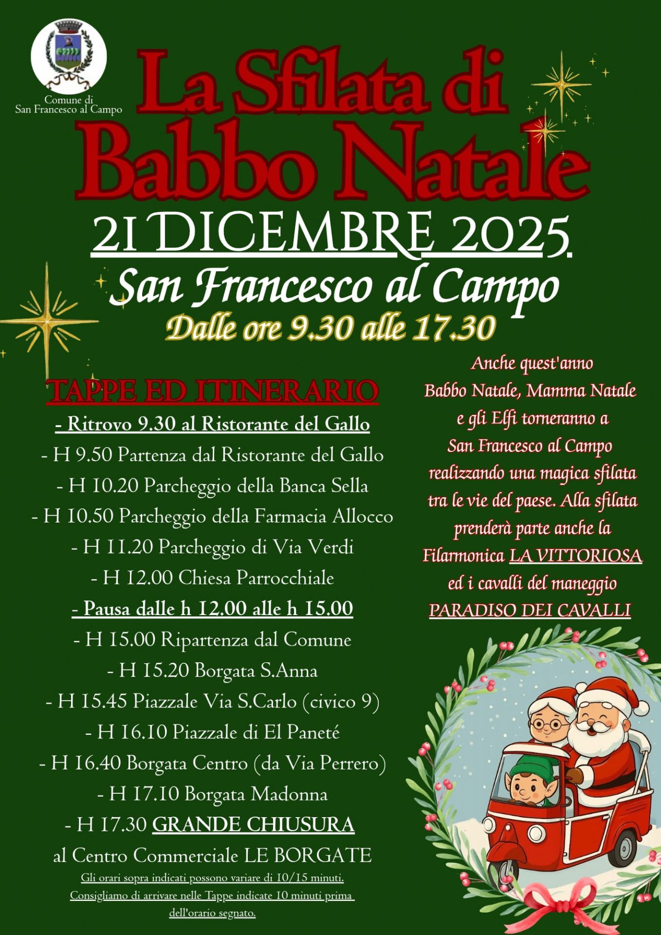 La giornata di domenica 21 dicembre, invece, sarà interamente dedicata alla grande Sfilata di Babbo Natale, che attraverserà tutto il paese. Partirà dalla Grangia alle 9.30 e farà tappa ai Gamberi in zona Banca Sella, poi vicino alla farmacia per concludere la mattinata al Capoluogo in via Verdi e di fronte alla chiesa parrocchiale. Dopo la pausa per il pranzo (anche Babbo Natale mangia…) ripartirà dal municipio alle 15 e farà tappa a Sant'Anna, poi in via San Carlo, in via Torino davanti alla panetteria, poi al Centro e alla Madonna. Gran finale alle 17.30 sul piazzale del centro commerciale Le Borgate. Ad accompagnare Babbo Natale, i musici della filarmonica La Vittoriosa e gli amici del Paradiso dei Cavalli.