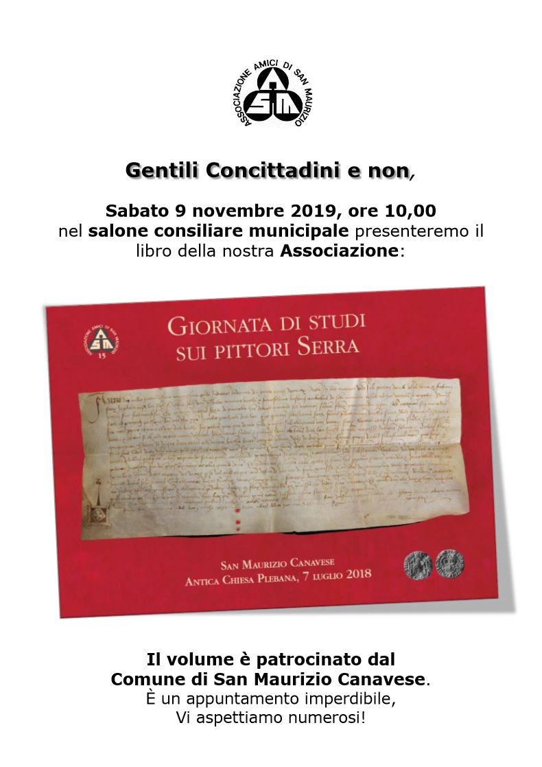Sabato 9 novembre, alle ore 10, nella sala consiliare del municipio l'Associazione Amici di San Maurizio presenta la pubblicazione dedicata alla giornata di studi sui pittori Serra svoltasi nel nostro Comune nell'estate 2018. Il volume è patrocinato dal Comune di San Maurizio Canavese. La presentazione è aperta a tutti.