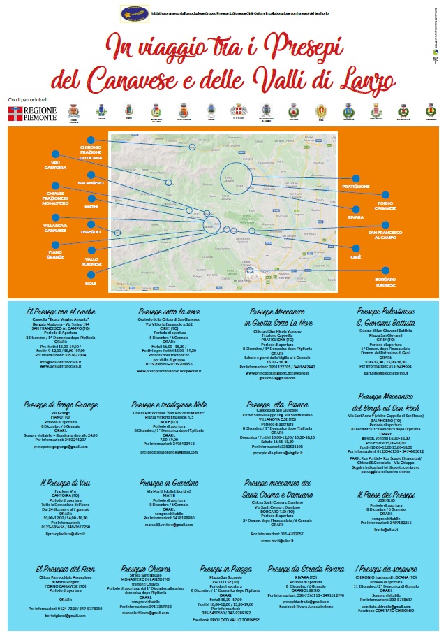 Nel periodo natalizio, il Presepe della tradizione. Viaggio tra i presepi del Canavese e delle Valli di Lanzo con i presepi di Nole, Ciriè, Borgaro, S.Francesco al Campo, Forno C.se, Rivara, Pratiglione, Mathi, Usseglio, Vallo, Fiano, Villanova C.se, Chiaves, Cantoira, Locana.