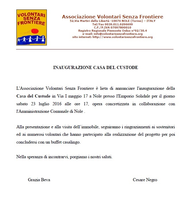 L'Associazione "Volontari Senza Frontiere" annuncia l'inaugurazione della "Casa del custode" in via I Maggio 17.