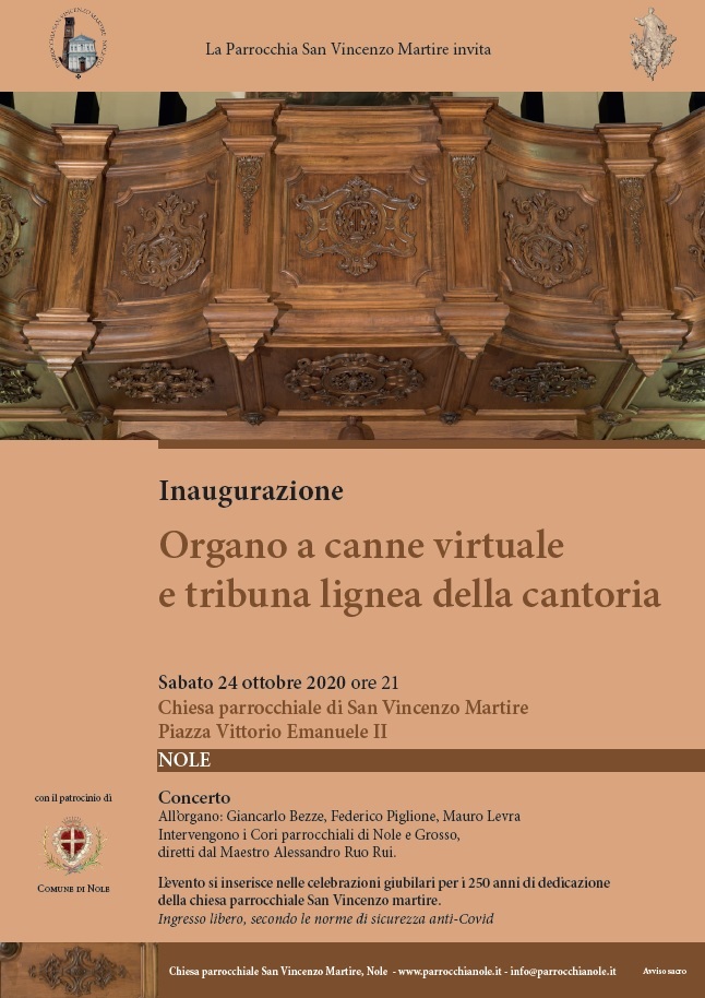Sabato 24 ottobre 2020 alle ore 21,00 si terrà l'inaugurazione dell'organo a canne virtuale e della tribuna lignea della cantoria presso la chiesa parrocchiale di San Vincenzo Martire, in piazza Vittorio Emanueole.