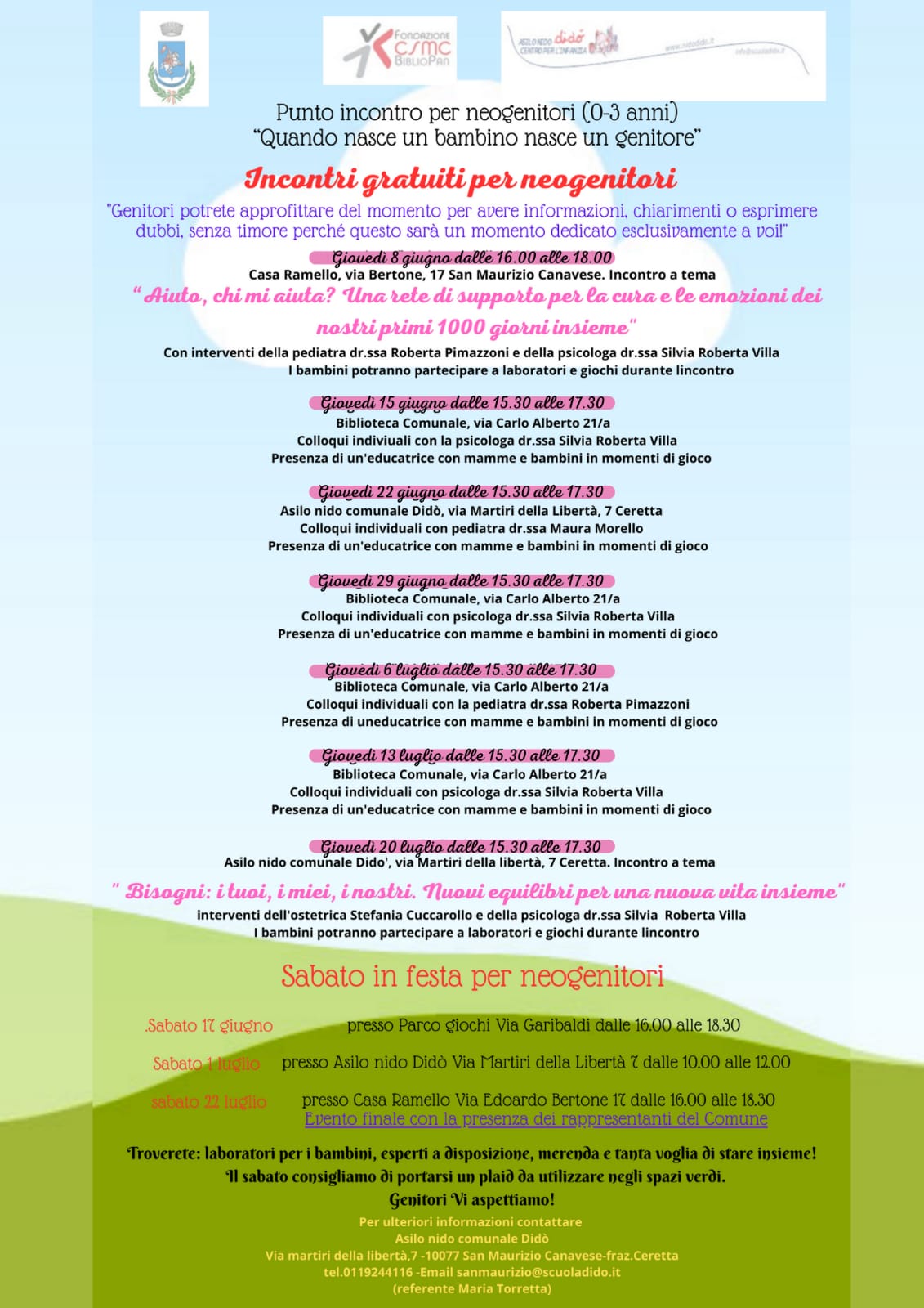 Il primo incontro è in programma giovedì prossimo, 8 giugno, dalle ore 16 alle 18 a Casa Marchini Ramello (via Bertone, 17) sul tema “Aiuto, chi mi aiuta? Una rete di supporto per la cura e le emozioni dei nostri primi 1000 giorni insieme”, con interventi della dottoressa Roberta Pimazzoni, pediatra, e della dottoressa Silvia Roberta Villa, psicologa. Nel corso dell'incontro, i bambini potranno partecipare a giochi e laboratori.