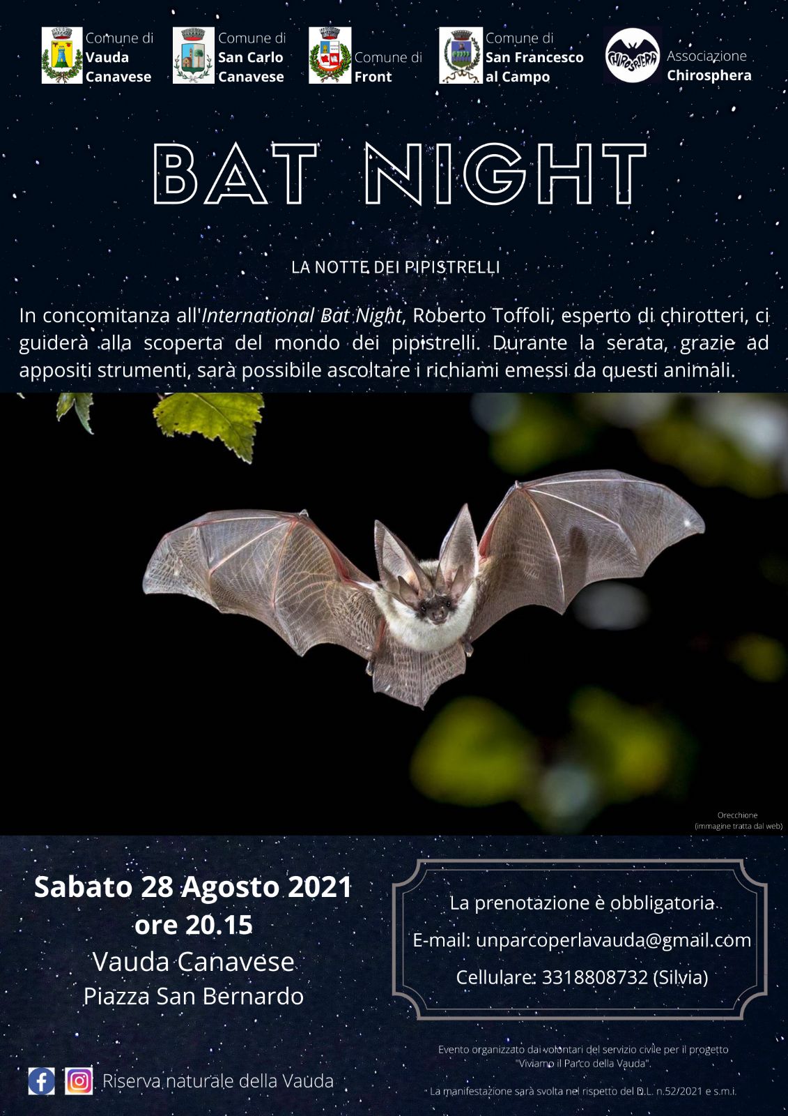 I volontari del Servizio Civile che prestano servizio presso i Comuni di Front, San Carlo Canavese, San Francesco al Campo e Vauda Canavese, in collaborazione con l'associazione Chirosphera organizzano per sabato 28 agosto 2021 alle ore 20,15 presso il Comune di Vauda Canavese, piazza San Bernardo, un incontro per conoscere il mondo dei pipistrelli.