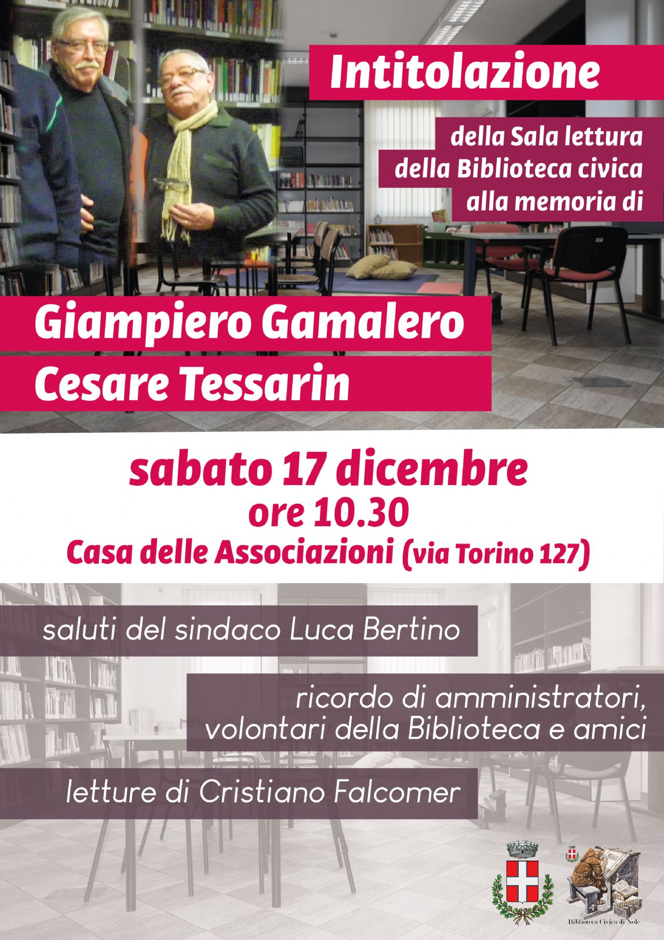 Sabato 17 dicembre 2022, alle ore 10,30, si terrà la cerimonia di intitolazione della sala lettura della Biblioteca Civica alla memoria di Giampiero Gamalero e Cesare Tessarin.