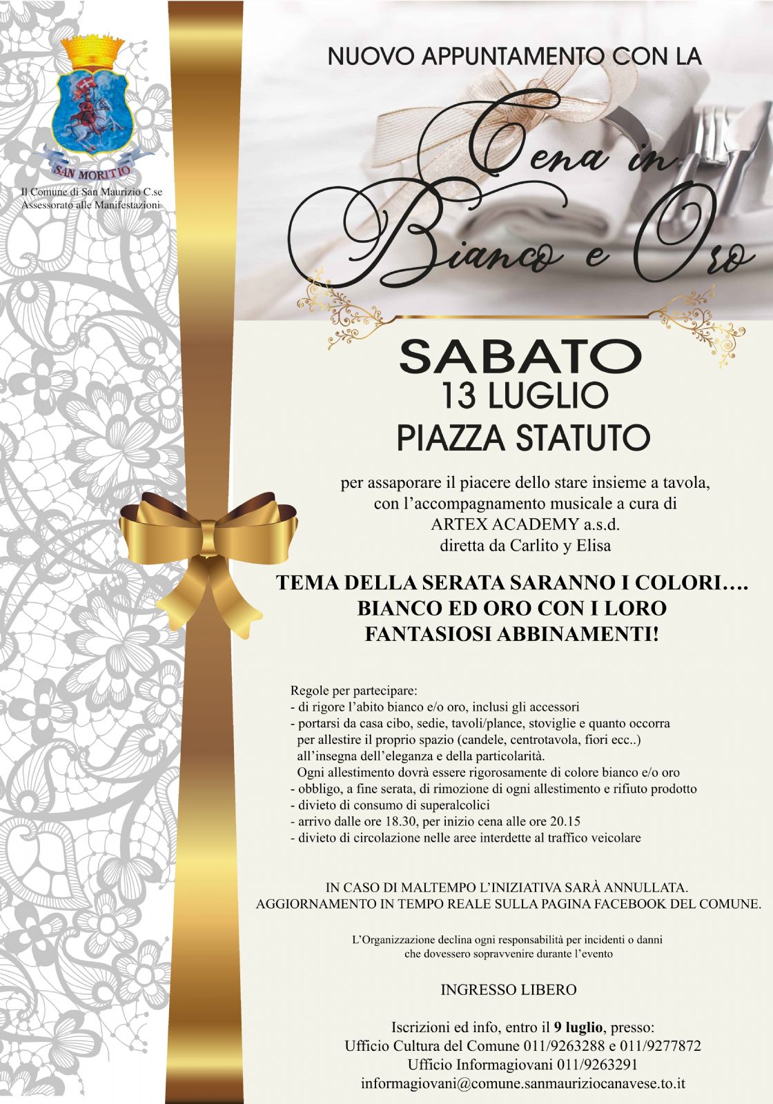 Sabato 13 luglio, in piazza Statuto, si svolgerà la Cena in bianco e oro, a cura dell'Assessorato alle Manifestazioni del Comune di San Maurizio Canavese.