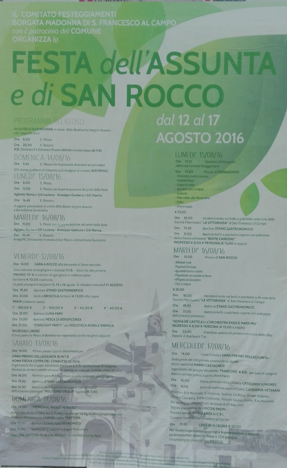 Tradizionale appuntamento di ferragosto, per la comunità sanfranceschese. Il Comitato festeggiamenti Borgata Madonna, con il patrocinio del Comune, organizza la festa dell'Assunta e di San Rocco. Da venerdì 12 a mercoledì 17 agosto, il consueto programma religioso, cuore dell'antica manifestazione, sarà accompagnato da un ricco calendario di eventi con appuntamenti per tutte le età e per tutti i gusti: sport, spettacoli, momenti conviviali e serate danzanti. Per consultare il programma completo, basta cliccare sulla foto a lato.