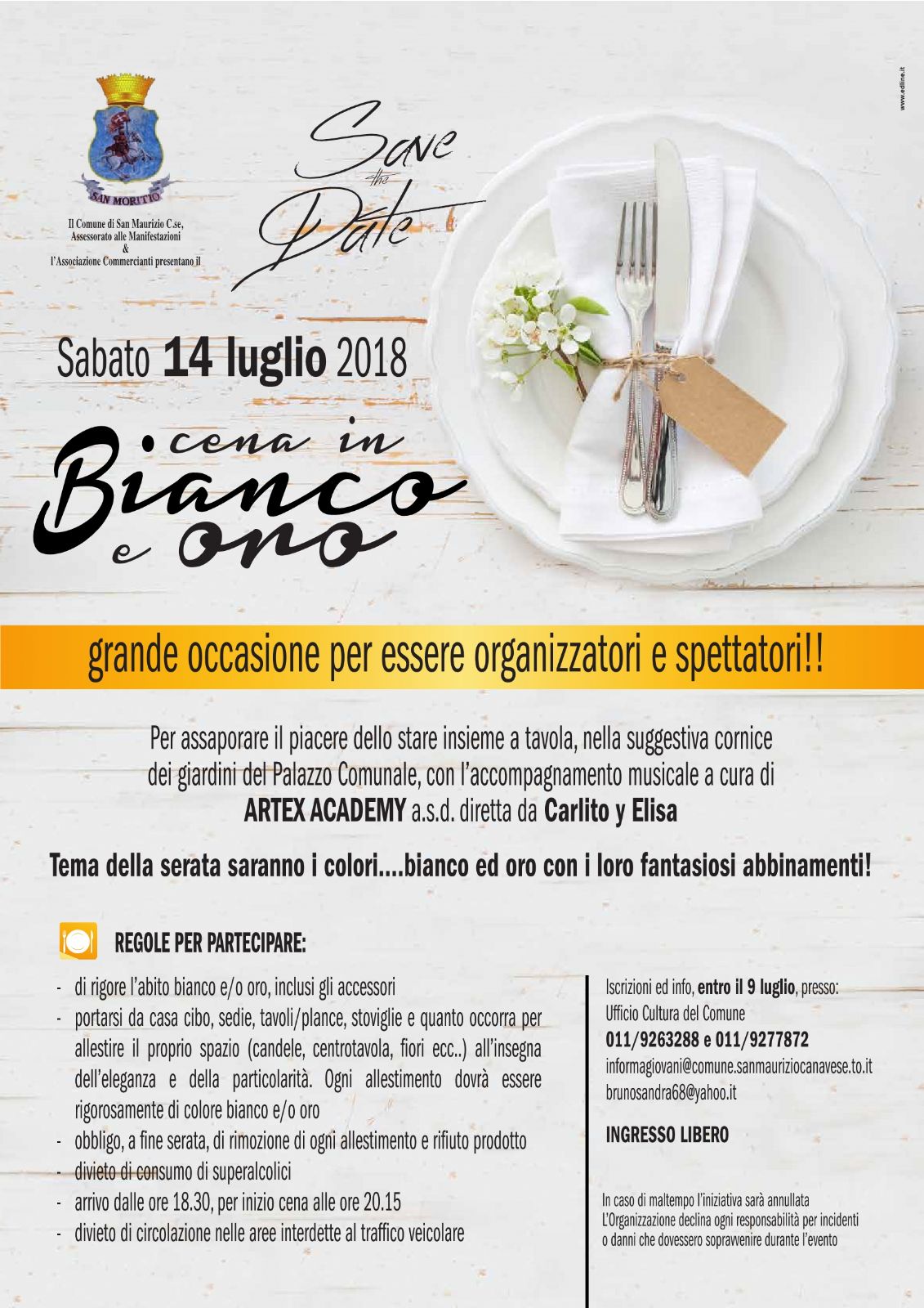 Sabato 14 luglio, nei giardini del palazzo comunale, si svolgerà la Cena in bianco e oro, a cura dell'Assessorato alle Manifestazioni del Comune di San Maurizio Canavese e dell'Associazione Commercianti.