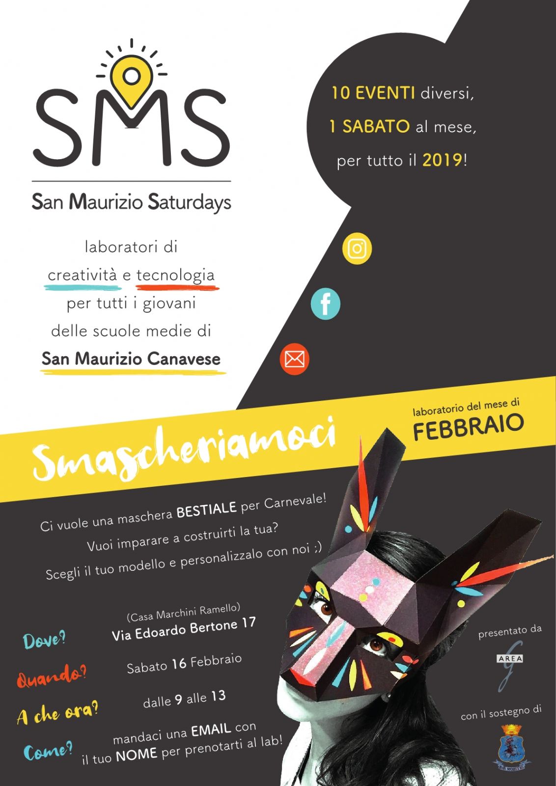 È la data di SMASCHERIAMOCI, il primo degli incontri e dei laboratori di creatività organizzati per i giovanissimi sanmauriziesi a Casa Marchini Ramello (un sabato al mese, per tutto il 2019).