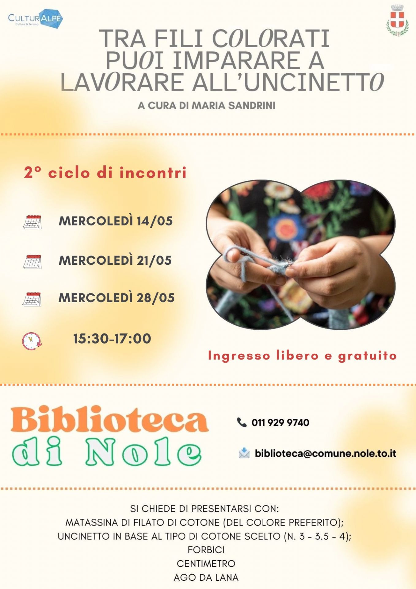 Si chiede di presentarsi con: matassina di filato di cotone (del colore preferito); uncinetto in base al tipo di cotone scelto (n. 3 - 3.5 - 4); forbici; centimetro; ago da lana