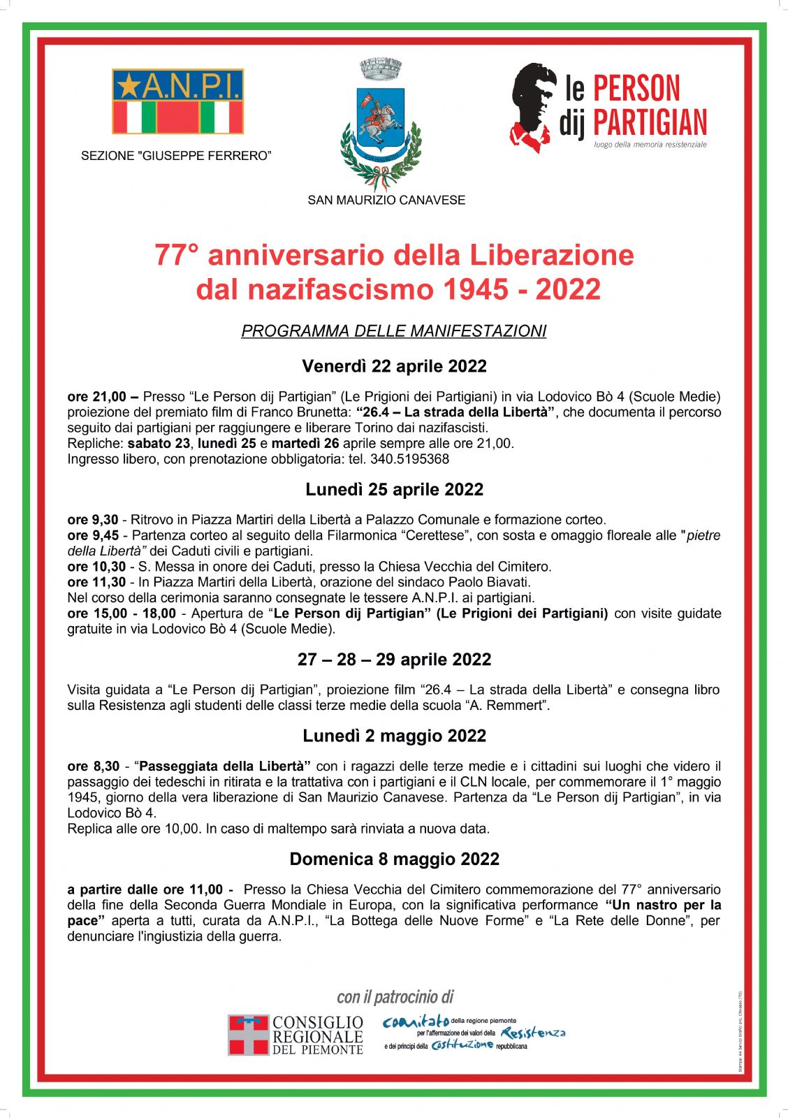 - Il secondo momento sarà lunedì 2 maggio alle ore 8.30, con la “Passeggiata della Libertà” insieme ai ragazzi di terza media e ai cittadini sui luoghi che videro il passaggio dei tedeschi in ritirata e la trattativa con i partigiani e il CLN locale, per commemorare il 1° maggio 1945, giorno della vera liberazione di San Maurizio Canavese. Partenza dalle Person dij Partigian.