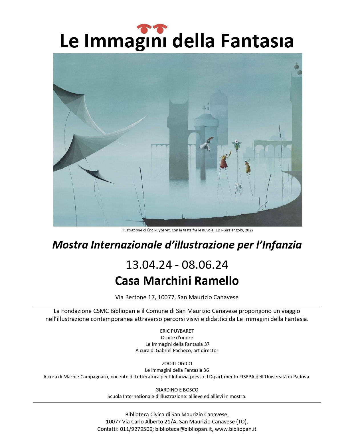 Da sabato 13 aprile fino all’8 giugno 2024 troverà spazio presso la sede espositiva di Casa Marchini Ramello (via Bertone 17) la Mostra Internazionale “Le Immagini della Fantasia”, quest’anno incentrata sui lavori dell’ospite d’onore della 37ª edizione, Éric Puybaret, e parte della sezione pedagogica della 36ª edizione, dal titolo “Zooillogico”, curata da Marnie Campagnaro, docente di Letteratura per l’infanzia presso il Dipartimento FISPPA dell’Università di Padova.