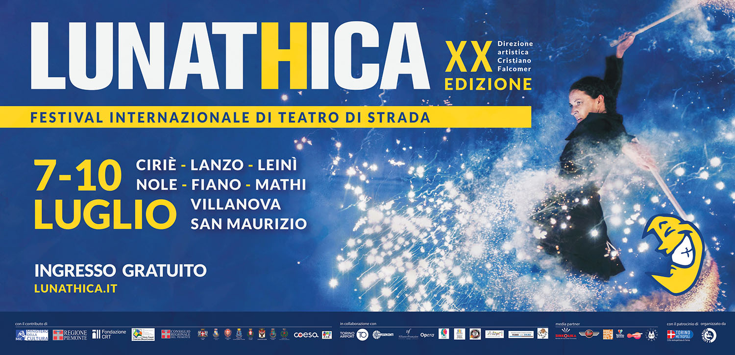 Dal 7 al 10 luglio torna Lunathica, il Festival Internazionale di Teatro di Strada diretto da Cristiano Falcomer che, in occasione della ventesima edizione, propone in quattro giorni (con orario mattutino, preserale e notturno) oltre 70 spettacoli di 13 compagnie internazionali nei comuni di Cirié, San Maurizio, Mathi, Nole, Fiano, Lanzo, Leinì e Villanova Canavese.