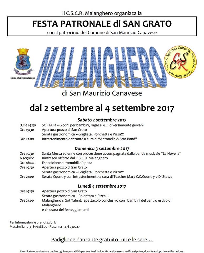 Fine settimana di festa, in frazione Malanghero, in onore del patrono San Grato. La manifestazione è organizzata dal CSCR di Malanghero, con il patrocinio del Comune di San Maurizio Canavese.