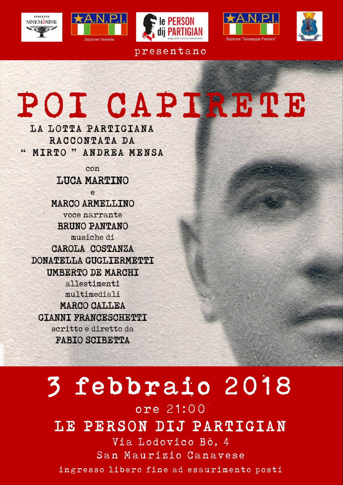 Sabato 3 febbraio, nell'ambito delle manifestazioni correlate al Giorno della Memoria, nuovo appuntamento presso le Person dij Partigian (via Bo, 4): alle ore 21 avrà luogo la rappresentazione "Poi capirete - La lotta partigiana raccontata da 'Mirto' Andrea Mensa".