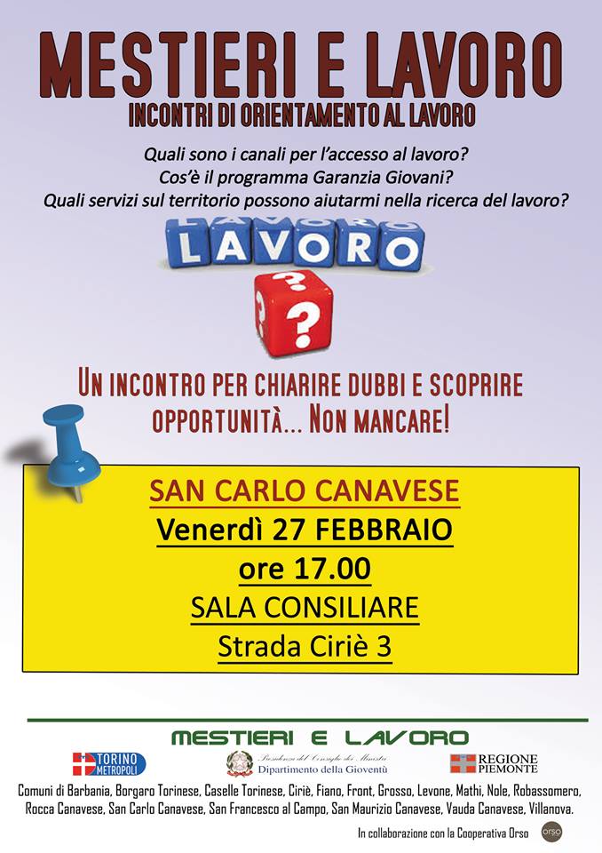 Si informa che in data 27/02/2015 alle ore 17,00 presso la Sala Consiliare del Comune di San Carlo Canavese si svolgerà un incontro di orientamento al lavoro. Si allega locandina dell'evento.