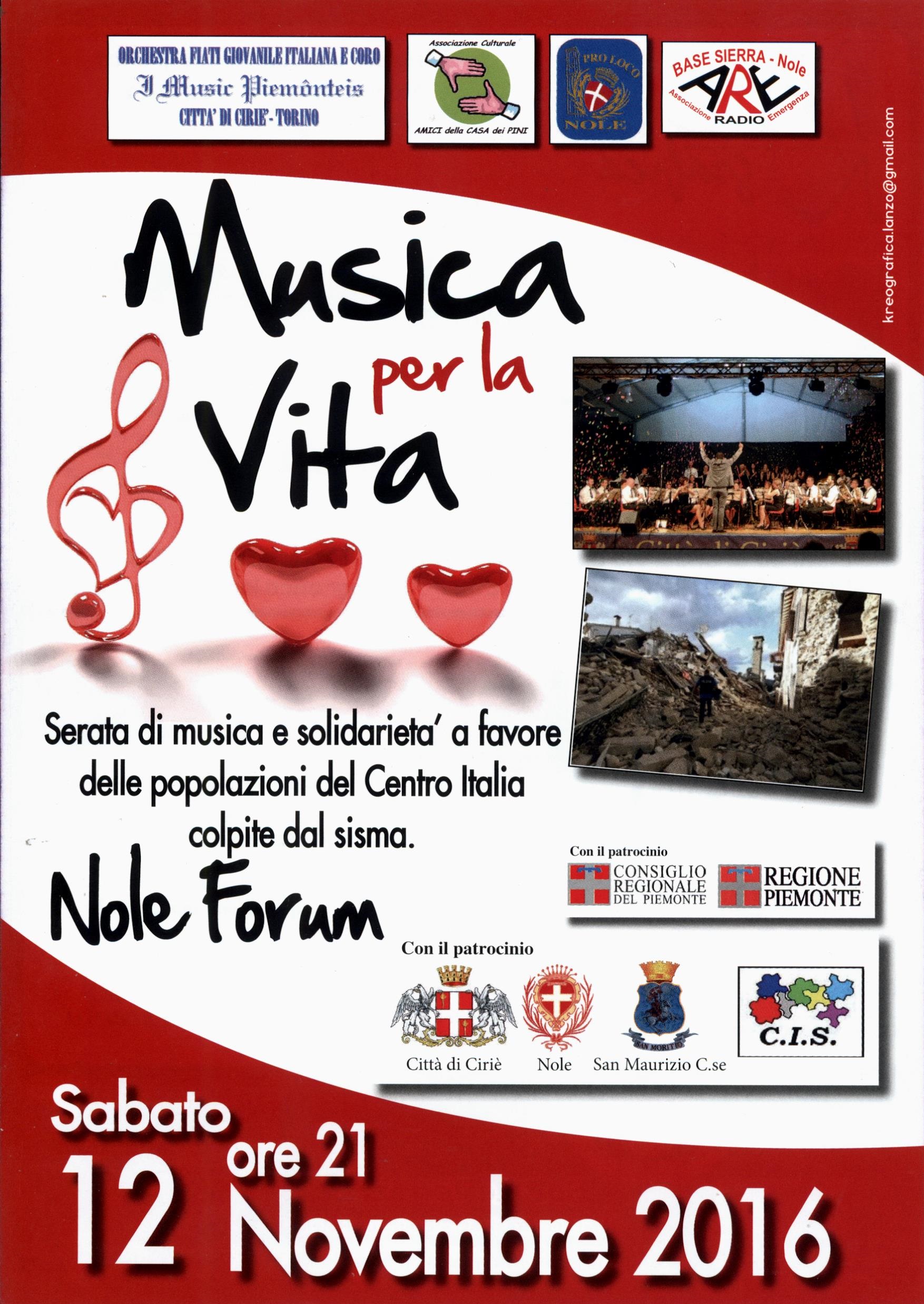 Serata di musica e solidarietà a favore delle popolazioni del centro Italia colpite dal sisma, sabato 12 novembre alle ore 21,00, con "I Music Piemonteis", presso la struttura polivalente "Nole Forum" di via Devesi (ex Erber).