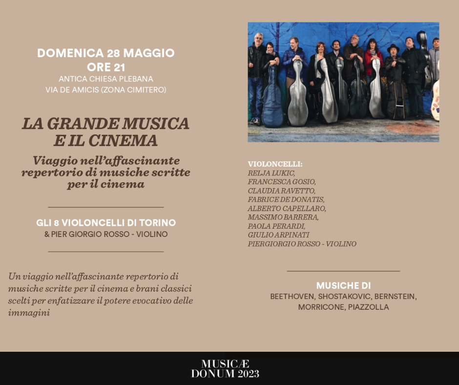 Domenica 28 maggio, ore 21, nell'Antica Chiesa Plebana (via De Amicis): La grande musica e il cinema. Viaggio nell'affascinante repertorio di musiche scritte per il cinema, con "Gli 8 violoncelli di Torino & Pier Giorgio Rosso violino". Musiche di Beethoven, Shostakovic, Bernstein, Morricone, Piazzolla.