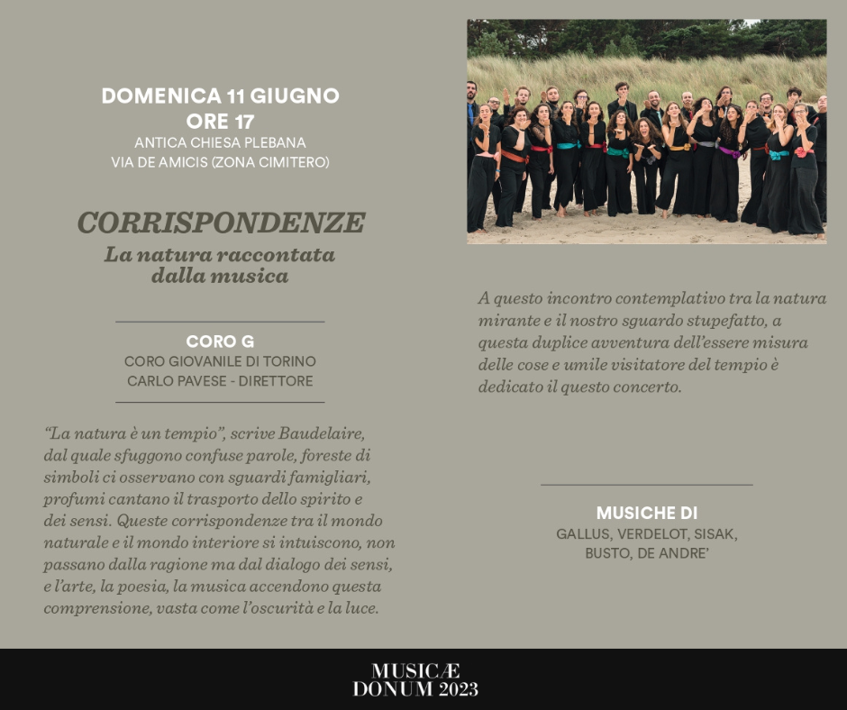Domenica 11 giugno, alle ore 17, nell'Antica Chiesa Plebana il "Coro G", Coro Giovanile di Torino diretto da Carlo Pavese, propone Corrispondenze. La natura raccontata dalla musica. Musiche di Gallus, Verdelot, Sisak, Busto, De André.