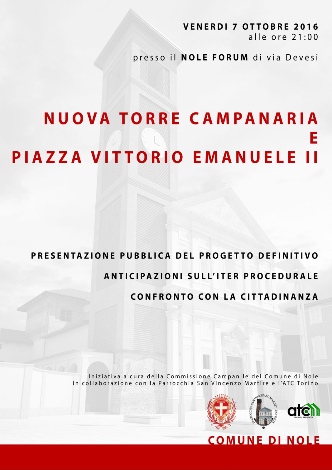 Venerdì 7 ottobre 2016, alle ore 21,00 presso la struttura "Nole forum" di via Devesi l'Amministrazione Comunale incontrerà la cittadinanza per presentare pubblicamente il progetto definitivo della nuova torre campanaria e della piazza Vittorio Emanuele.