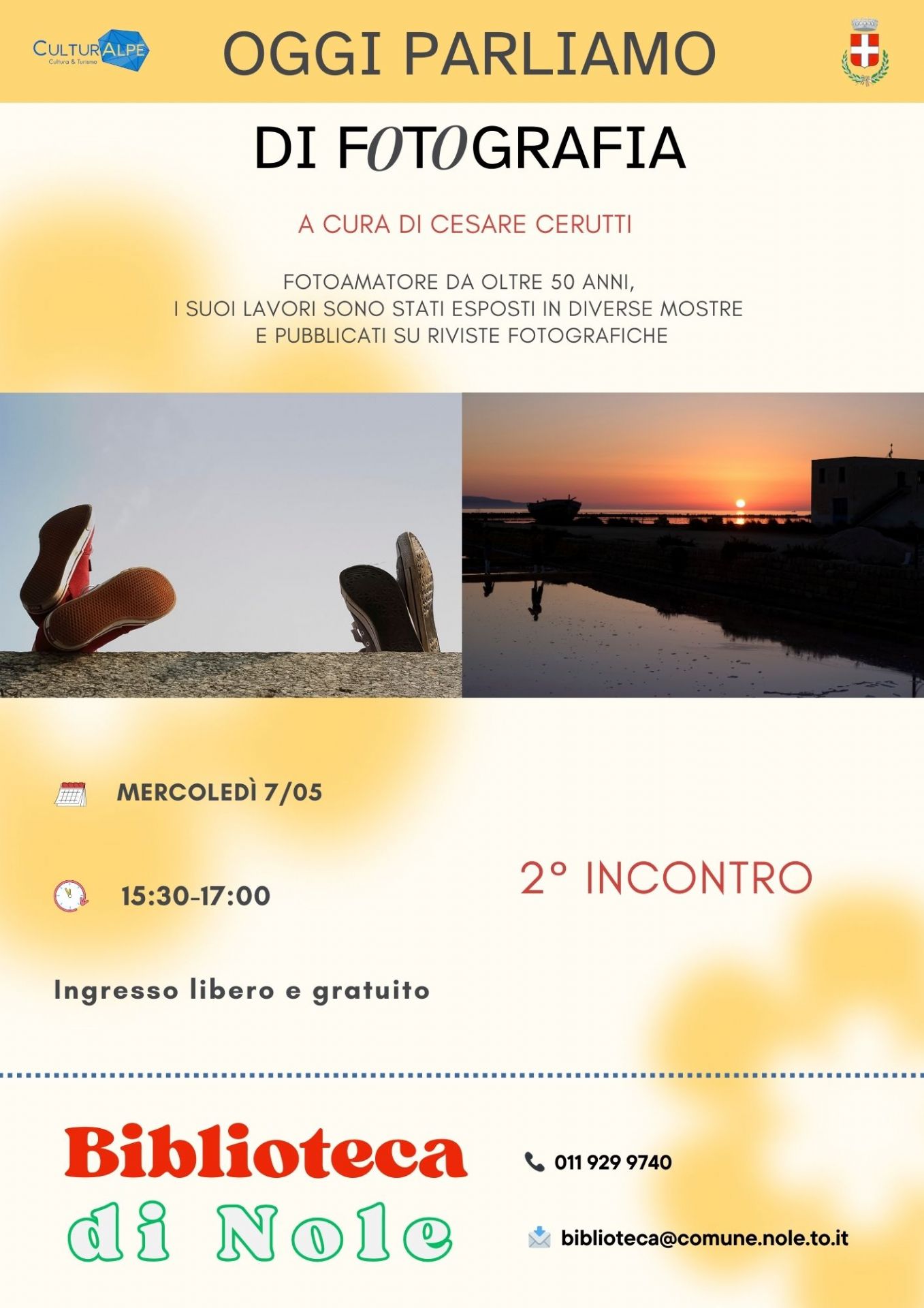Siamo lieti di comunicarvi che mercoledì 07 maggio presso i locali adiacenti alla Biblioteca di Nole, si terrà il secondo incontro sul tema della fotografia. Si tratta di un incontro indirizzato a coloro che desiderano accostarsi a quest'arte e a coloro che sono già alle prime armi e che desiderano implementare questa loro passione.