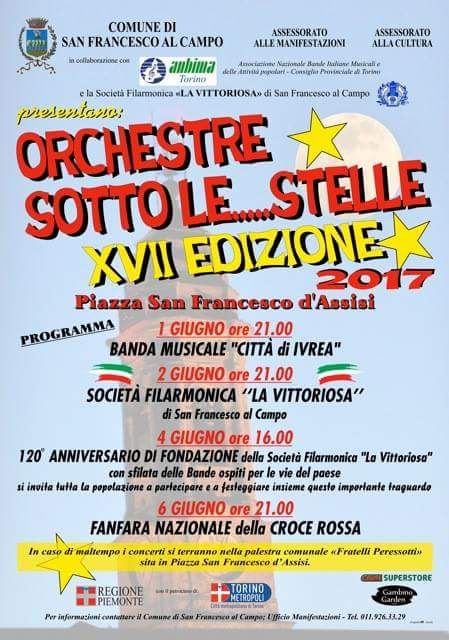 In caso di maltempo i concerti si terranno nella palestra comunale Fratelli Peressotti di piazza San Francesco d'Assisi. La manifestazione è organizzata dal Comune di San Francesco al Campo in collaborazione con Anbima, Società Filarmonica La Vittoriosa, e con il patrocinio di Regione Piemonte, Città Metropolitana di Torino, Crai Superstore e Gambino Garden. Ingresso libero.