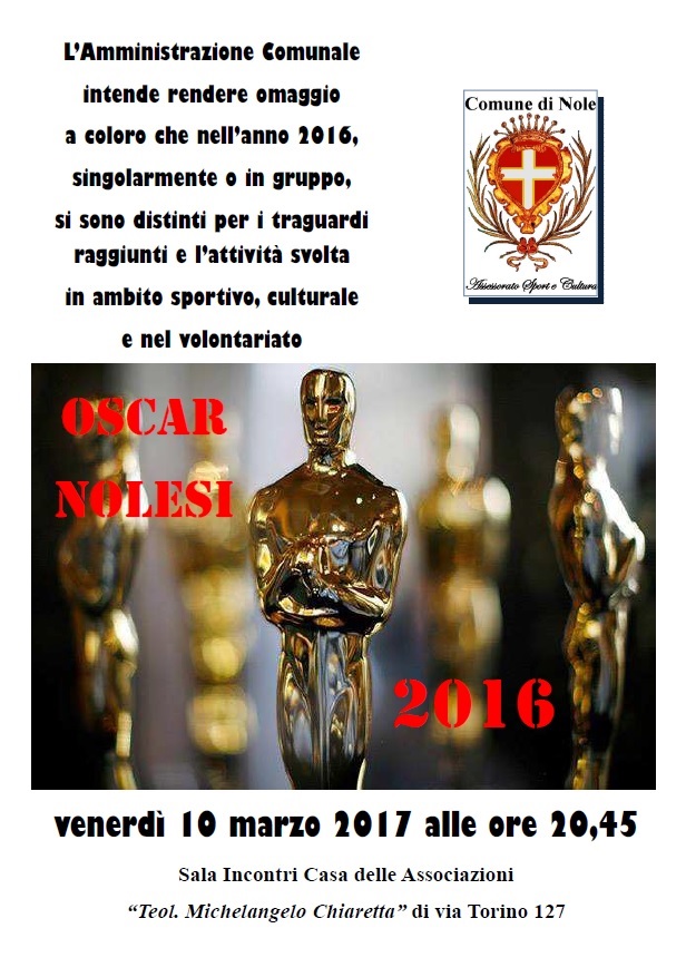La cerimonia per l'attribuzione degli "Oscar Nolesi" 2016 si terrà venerdì 10 marzo 2017 alle ore 20,45 presso la "Sala Incontri" di via Torino 127, Casa delle Associazioni "Teol. Michelangelo Chiaretta".