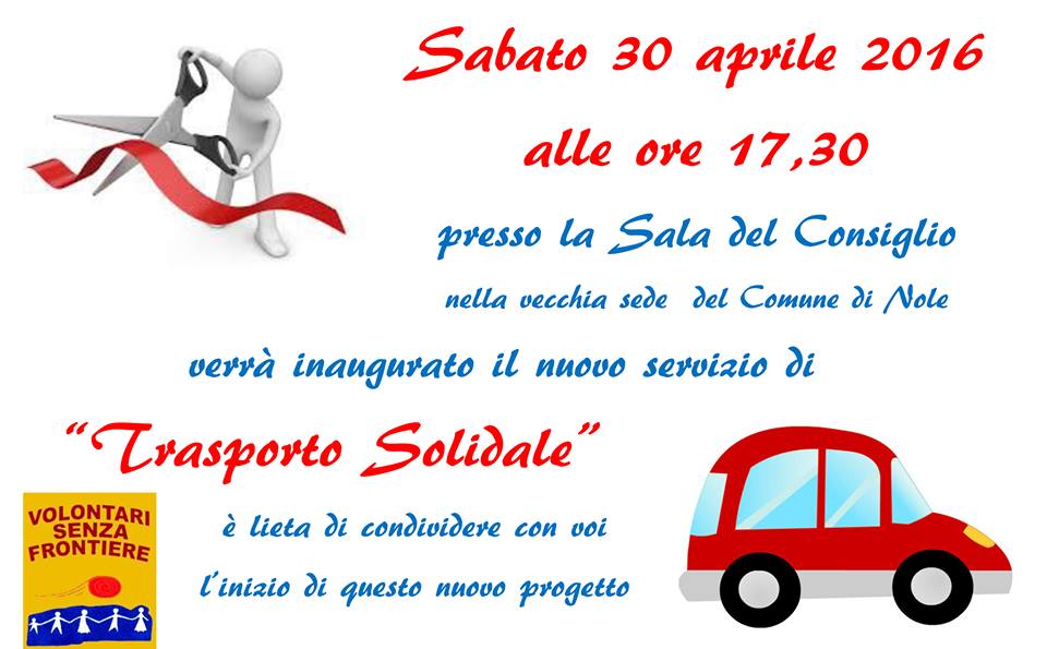 Sabato 30 aprile 2016 si inaugura il progetto "trasporto solidale" presso la ex sala consiliare di via Torino 127 (vecchio comune) alle ore 17,30, progetto realizzato in collaborazione fra l'Associazione Volontari Senza Frontiere e il Comune di Nole. Verranno presentati i dieci autisti e il capoprogetto e verranno spiegati le modalità di accesso ai trasporti e il costo.