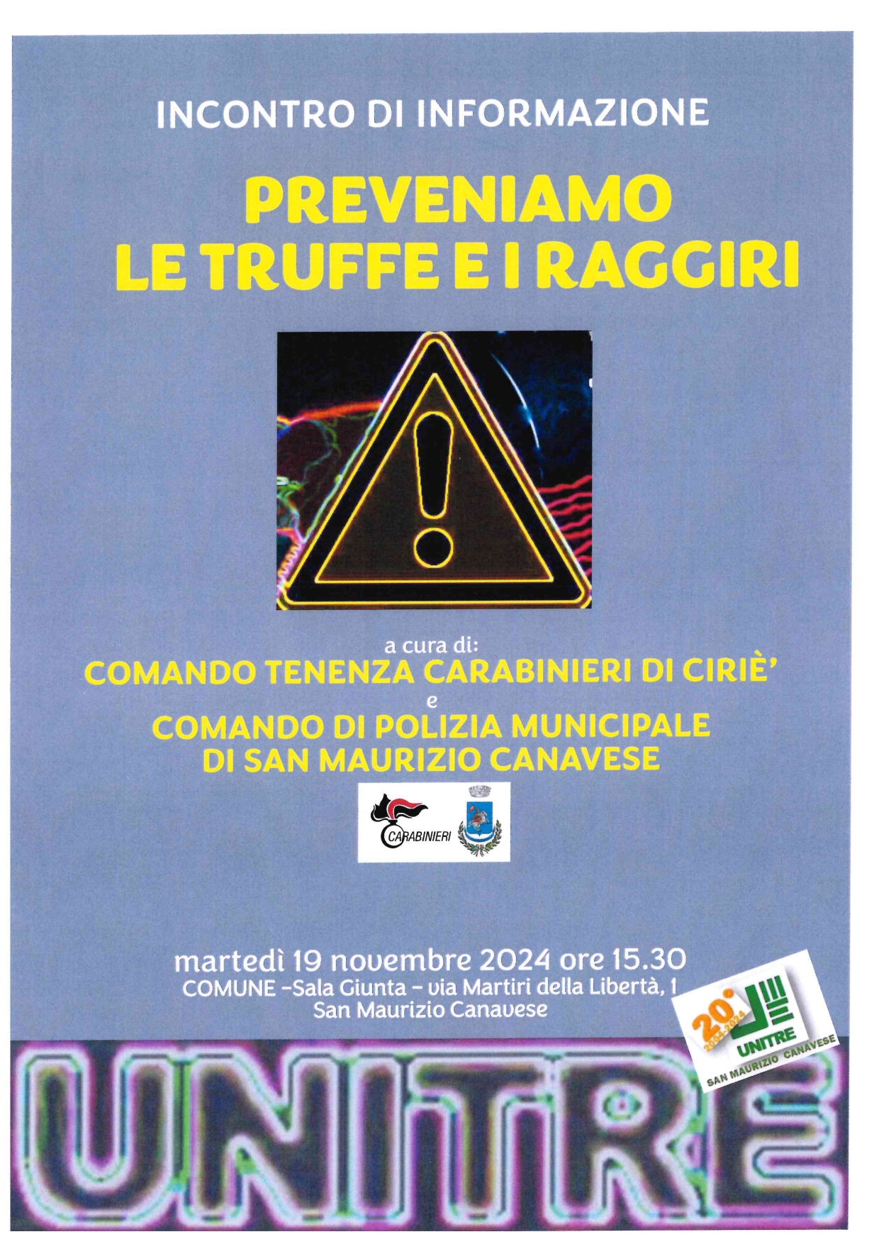 L'Unitre di San Maurizio Canavese ci invita a un incontro con i Carabinieri di Ciriè e alla nostra Polizia Locale per imparare a prevenire e a difenderci da truffe e raggiri. L'appuntamento è in municipio alle ore 15.30 di martedì 19 novembre.