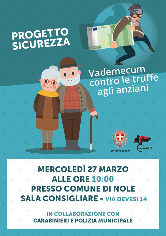Mercoledì 27 marzo 2019, alle ore 10,00 presso la sala consiliare di via Devesi 14, si terrà la presentazione del progetto sicurezza, vademecum contro le truffe agli anziani, in collaborazione con i Carabinieri e la Polizia Municipale.