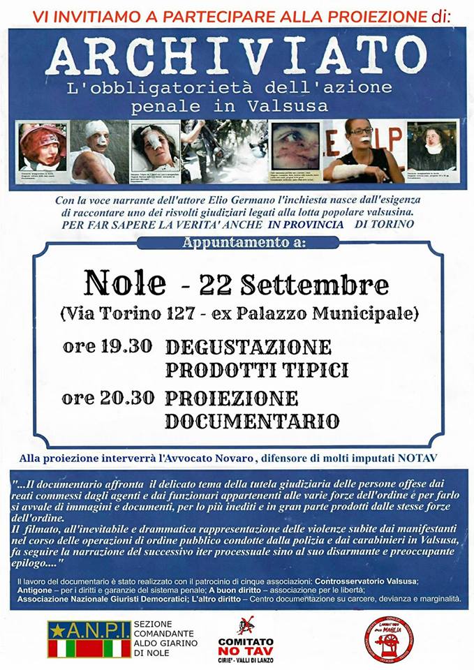 L'ANPI sezione "Comandante Aldo Giardino" di Nole organizza per Venerdì 22 settembre 2017 la proiezione del documentario "archiviato", con la voce narrante dell'attore Elio Germano. L'evento si terrà presso la sala incontri di via Torino 127 (casa delle associazioni "Teol. Michelangelo Chiaretta"). Programma: