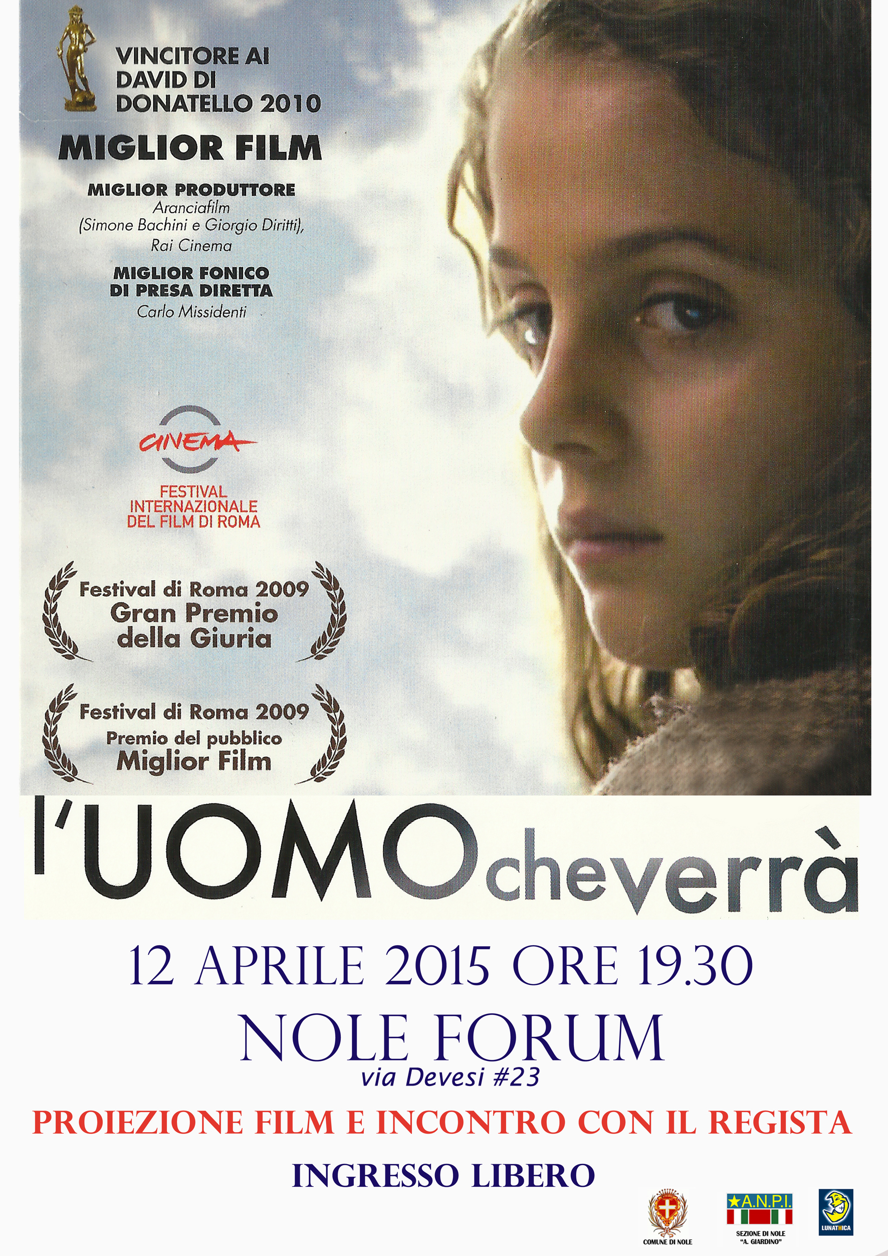 Domenica 12 aprile 2015 alle ore 19,30, presso la struttura polivalente "Nole forum" di Via Devesi (ex Erber), si terrà la proiezione del film "L'UOMO CHE VERRA'" ingresso libero. Il film è stato prodotto da RAI CINEMA ed ha ricevuto tre premi "David di Donatello" nel 2010 (miglior film, miglior produttore e miglior fonico di presa diretta) nonchè il "Gran Premio della Giuria", il "Premio del pubblico" ed il premio "La meglio gioventù" al "Festival Internazionale del Film di Roma" nel 2009.