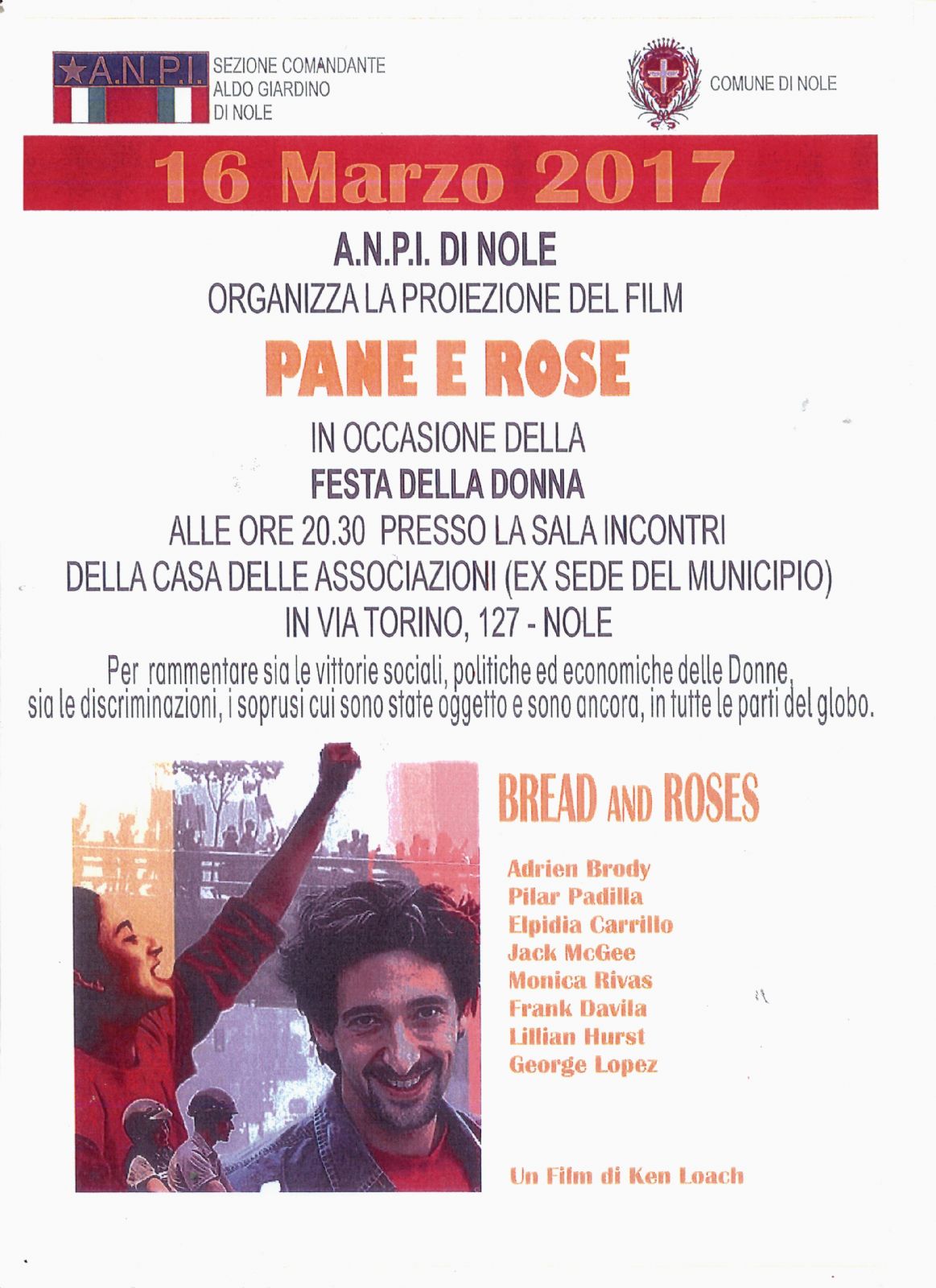 IL 16 marzo 2017, alle ore 20,30, l'A.N.P.I. di Nole organizza la proiezione del film "PANE E ROSE" di Ken Loach per rammentare sia le vittorie sociali, politiche ed economiche delle donne, sia le discriminazioni, i soprusi cui sono state oggetto e sono ancora, in tutte le parti del globo.