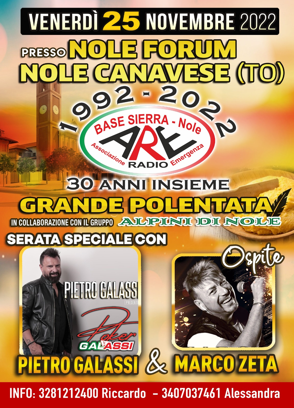 Venerdì 25 novembre 2022 presso il Centro Polivalente "Nole Forum" di via Devesi, grande polentata in collaborazione con il gruppo Alpini di Nole. Serata speciale con Pietro Galassi & Marzo Zeta.