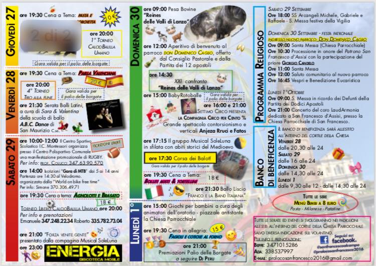La Pro loco di San Francesco in collaborazione con l'Amministrazione comunale organizza da giovedì 27 giugno a lunedì 1° ottobre la festa patronale dedicata a San Francesco d'Assisi. Come da tradizione sarà un pout pourri di appuntamenti religiosi, momenti di festa, appuntamenti gastronomici, musica e balli e divertimento con il luna park. Inoltre, verranno disputate le prove per l'assegnazione del Palio delle Borgate: giovedì 27 alle 20 si giocherà al calcetto umano; venerdì 28 alle 20, il tiro alla fune e domenica 30 settembre alle 17,30 la spettacolare Corsa dij balot. Chi vincerà questa edizione?