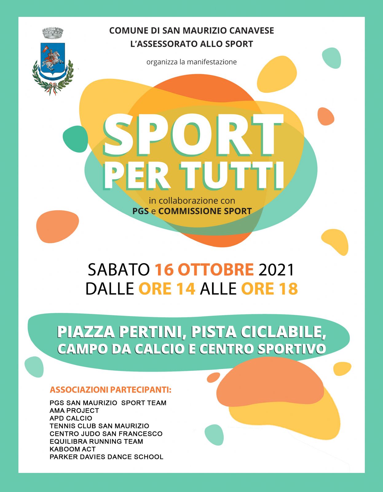 L'evento, organizzato dall'assessorato allo Sport del Comune di San Maurizio Canavese in collaborazione con Pgs e Commissione Sport, vedrà infatti la partecipazione attiva di Pgs San Maurizio Sport Team, Ama Project, Apd Calcio, Tennis Club San Maurizio, Centro Judo San Francesco, Equilibra Running Team, Kaboom Act, Parker Davies Dance School.