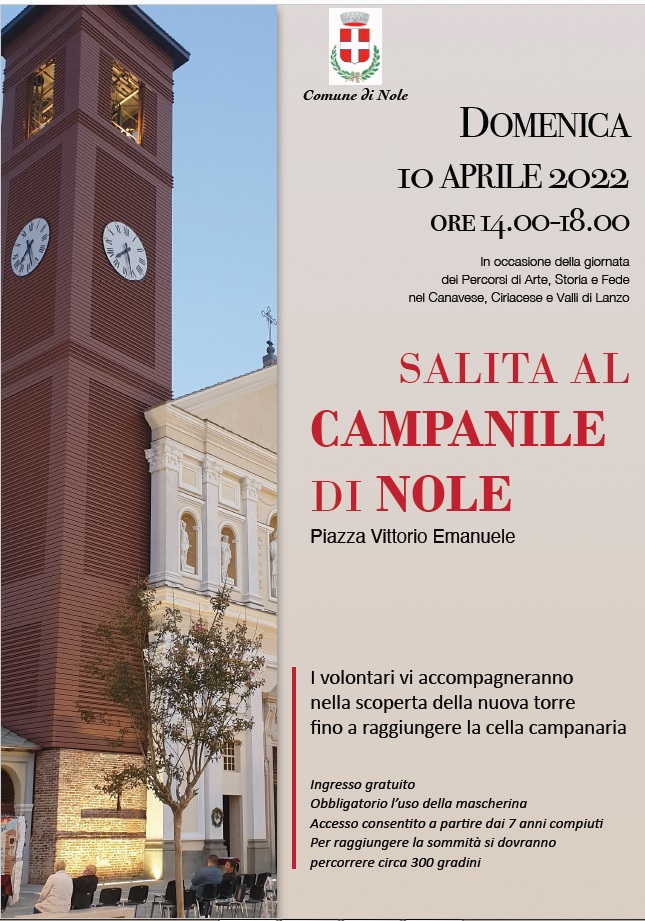 In occasione della giornata dei percorsi di arte, storia e fede nel Canavese, Ciriacese e Valli di Lanzo, domenica 10 aprile 2022 dalle 14,00 alle 18,00 salita al campanile di Nole di piazza Vittorio Emanuele. I volontari accompagneranno i visitatori nella scoperta della nuova torre fino a raggiungere la cella campanaria.