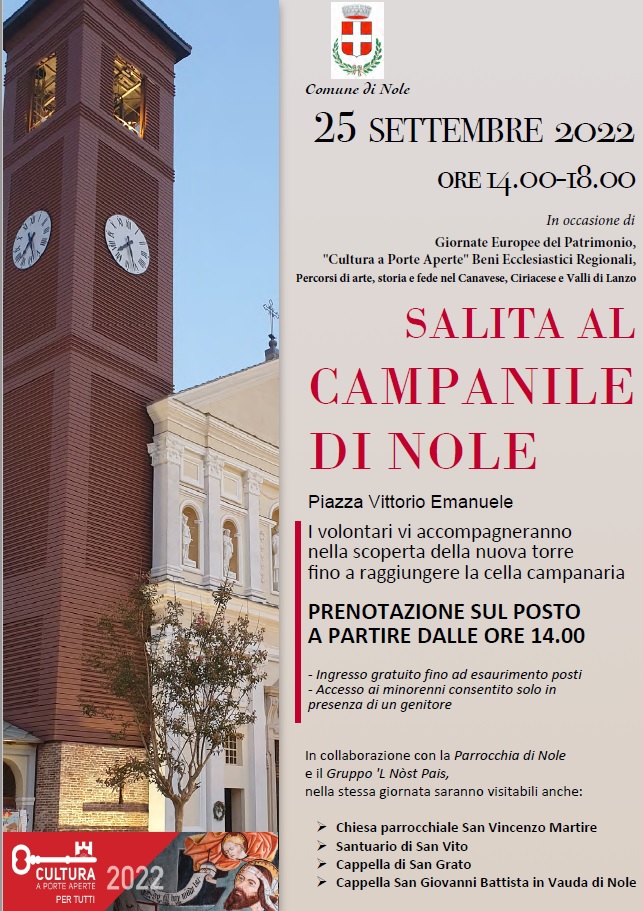 Domenica 25 settembre 2022, dalle ore 14,00 alle ore 18,00, in occasione delle giornate europee del patrimonio, "Cultura a Porte Aperte" beni ecclesiastici regionali, percorsi di arte, storia e fede nel Canavese, ciriacese e valli di Lanzo, sarà possibile effettuare la salita al campanile di Nole (piazza Vittorio Emanuele).