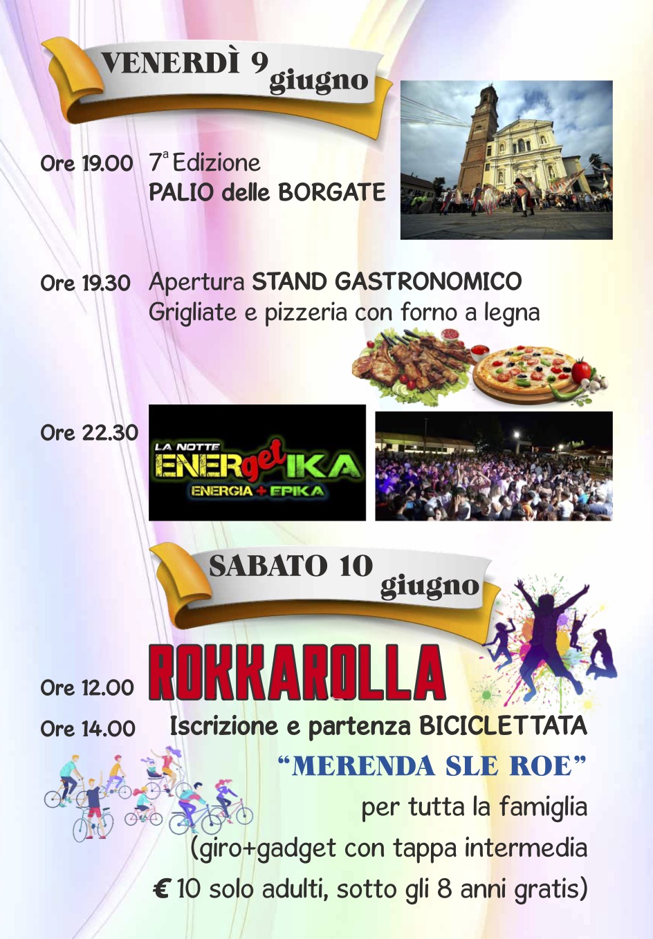 Fino domenica 11 giugno, 4 giorni di attività per adulti e bambini con musica, Palio delle Borgate, stand gastronomici, festival ROKKAROLLA, attività e tornei sportivi, corso della Croce Rossa e concerto di beneficienza contro la SLA.
