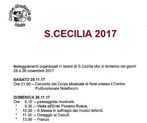 Il Corpo Musicale invita tutta la cittadinanza al concerto di Santa Cecilia che si terrà sabato 25 novembre 2017 alle ore 21,00 presso la struttura polivalente "Nole Forum" di via Devesi.