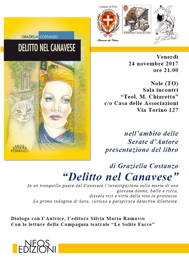 Nell'ambito de "Serate d'autore" la Neos Edizioni, in collaborazione con la Biblioteca Civica di Nole, L'Assessorato alla Cultura del Comune di Nole e la compagnia teatrale "Le solite facce", vi invita a partecipare alla presentazione del romanzo di Graziella Costanzo "Delitto nel Canavese".