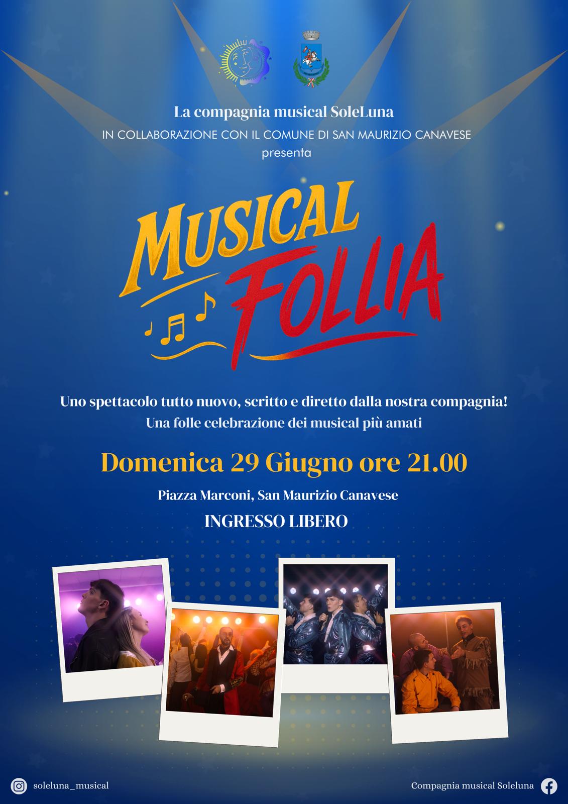 La compagnia SoleLuna in collaborazione con il Comune di San Maurizio Canavese presenta "Musical Follia". L'appuntamento è per domenica 29 giugno alle ore 21 in piazza Marconi. L'ingresso è libero.