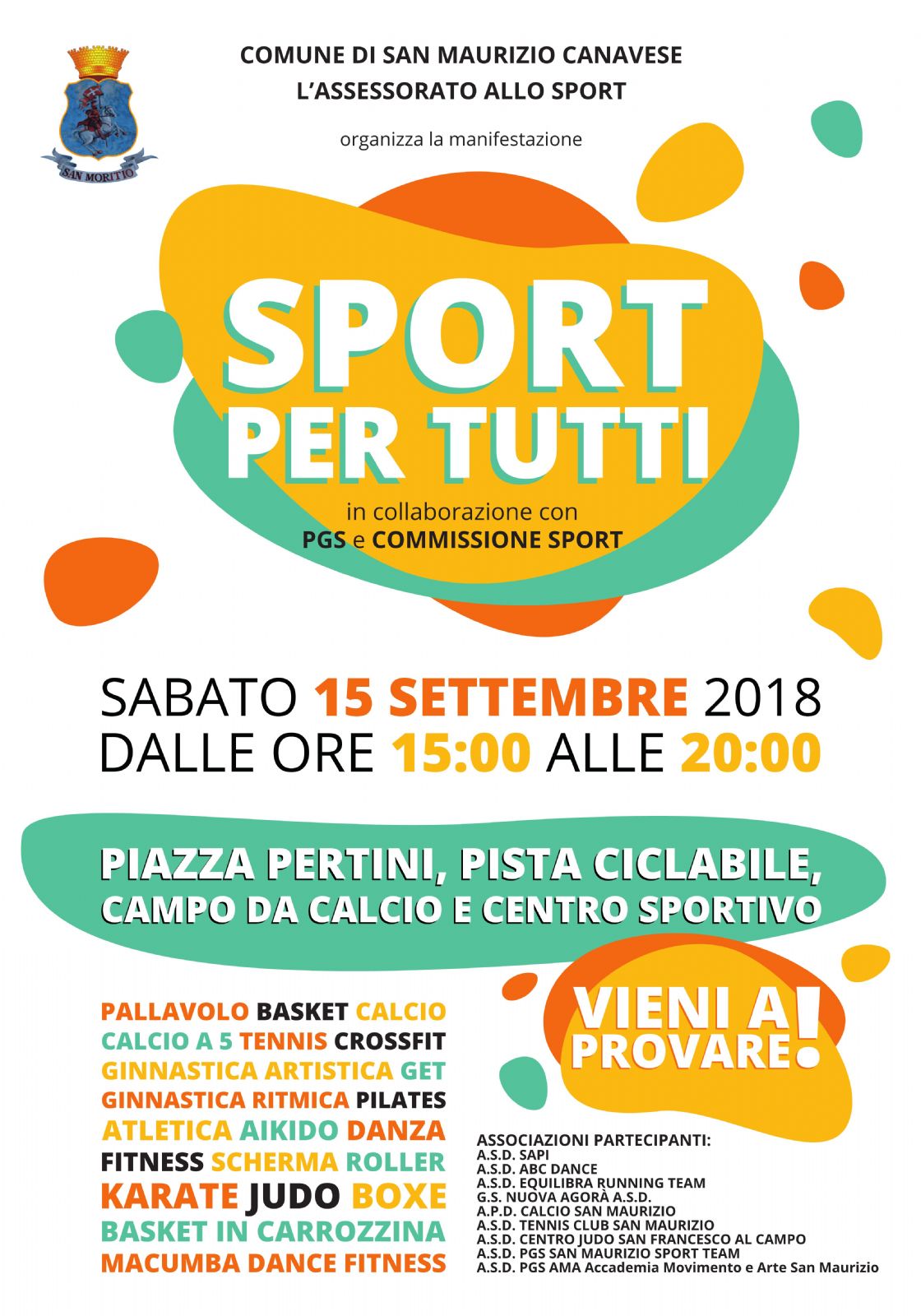 La giornata, organizzata dall'assessorato allo Sport del Comune di San Maurizio Canavese in collaborazione con Pgs e Commissione Sport, vedrà infatti la partecipazione attiva di Sapi, Equilibra Running Team, Nuova Agorà, Calcio San Maurizio, Tennis Club San Maurizio, Abc Dance, Pgs Ama Accademia Movimento e Arte San Maurizio, Pgs San Maurizio Sport Team.