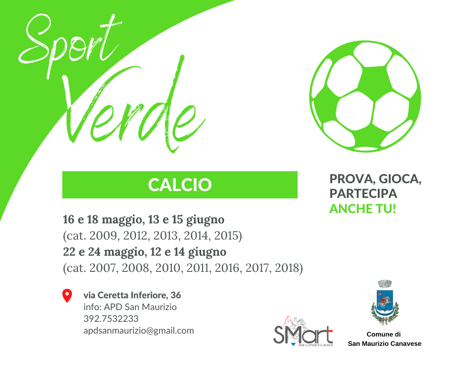 SPORT VERDE prevede poi altri tre appuntamenti con il calcio per le stesse categorie: 18 maggio, 13 e 15 giugno. Alle categorie 2007, 2008, 2010, 2011, 2016, 2017, 2018 saranno invece dedicati i giorni 22 e 24 maggio, 12 e 14 giugno.