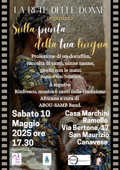 Sabato 10 maggio alle ore 17.30 a Casa Marchini Ramello (via Bertone, 17) la Rete delle Donne organizza “Sulla punta della tua lingua”, proiezione di un docufilm, raccolta di canti, ninne nanne, giochi con le mani. A seguire rinfresco, musica e canti della tradizione africana.