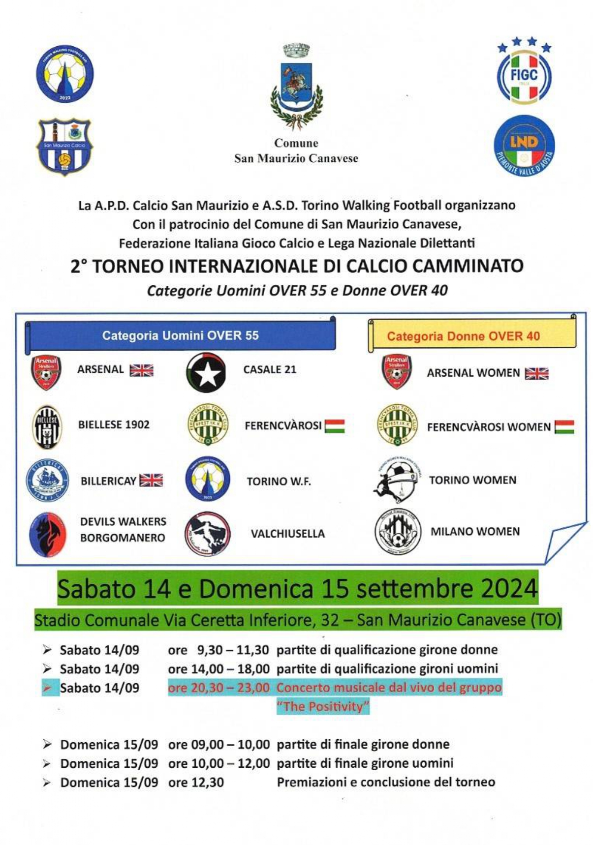 Sabato 14 e domenica 15 settembre presso il campo sportivo di via Ceretta Inferiore APD Calcio San Maurizio e ASD Torino Walking Football con il patrocinio del Comune di San Maurizio Canavese, della Federazione Italiana Gioco Calcio e della Lega Nazionale Dilettanti organizzano il secondo Torneo Internazionale di Walking Football, dedicato a uomini over 65 e donne over 40.
