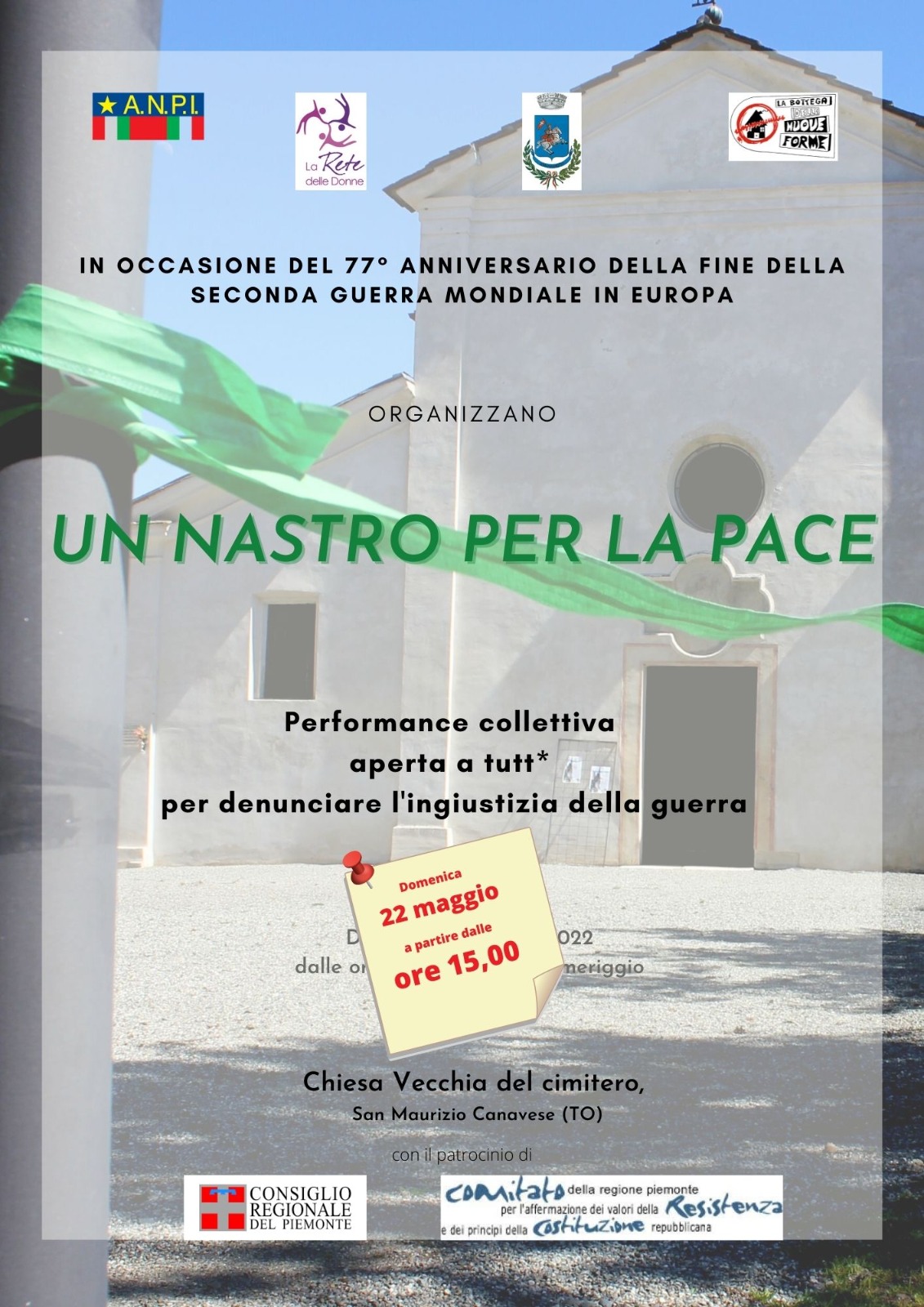 Si svolgerà questa domenica, 22 maggio, la performance “Un nastro per la pace”, commemorazione del 77° anniversario della fine della Seconda Guerra Mondiale in Europa, per denunciare l'ingiustizia della guerra. L'appuntamento (inizialmente previsto per l'8 maggio ma poi rinviato causa maltempo) è presso la Chiesa Vecchia del Cimitero a partire dalle ore 11.