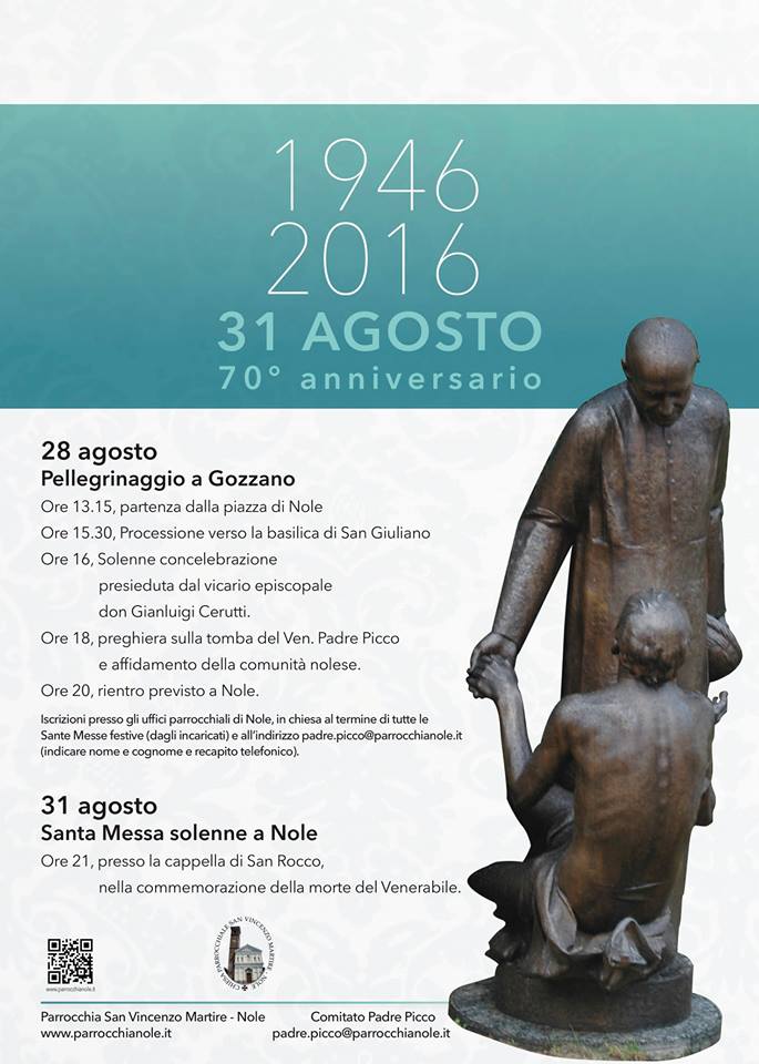 Anche quest’anno vogliamo unirci alla comunità di Gozzano che celebra i 70 anni della morte del Ven. Padre Picco, compiendo il tradizionale pellegrinaggio sui luoghi del gesuita nolese. La parrocchia di Nole e il Comitato Padre Picco invitano tutti i nolesi, i devoti e coloro che intendono conoscere la figura di Padre Picco a partecipare al pellegrinaggio, in cui, recandoci sulla sua tomba, affideremo al nostro illustre concittadino l’intera comunità parrocchiale nolese.