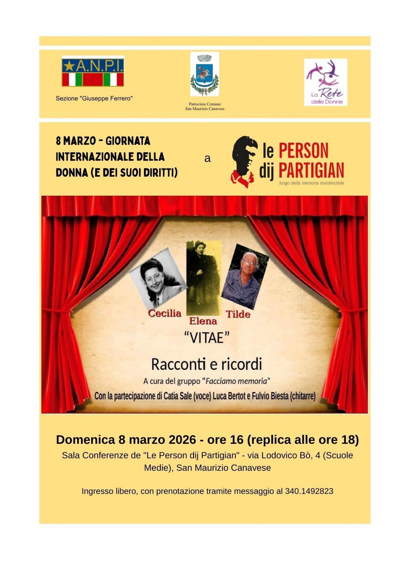 Domenica 8 marzo, in occasione della giornata internazionale della donna, la locale sezione dell'Anpi e l'associazione "La Rete delle Donne" organizzano "Vitae", racconti e ricordi sulla vita di tre donne canavesane le cui vicende si intrecciarono nel 1944 all'epoca dell'occupazione tedesca.